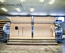--- The Stageliner29 has two show-hatches and is easily assembled. The interior can be designed as per customer specifications, either with built in or movable furniture. Various multimedia connections have been installed in the interior as well as the cavity of the vehicle. Interior, exterior and subfloor sound system available. LED-RGB lighting with remote control is installed throughout the interior and subfloor. We would be happy to plan your Event or Road show with you.FACTS: - light colour vintage flooring (water repellant) - various different RGB LED effects - video connections HDMI (2) - DVD / Hifi sound - 12 volt Battery - interior speakers (4) - exterior and subfloor speakers (2) - 2 stage opnening each approx. 3 meters. - dimmable ceiling and hatch lighting (LED Downlights) - operational 12 V driving lighting, operational without towing vehicle - mirror polished outer shell √ Interior design: eg. Rear wall with screen and presentation area, built in furniture, sideboard with built in refrigeration etc. All can be realised at short notice. √ Delivery service, Chauffeurs, Promoter, towing vehicles, vehicle foiling and site permits, as per customer requirements: Nothing is impossible. Example I Cocktail & Co. |
