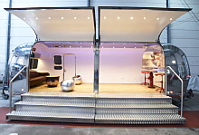--- The Stageliner27 has two show-hatches and is easily assembled. The interior can be designed as per customer specifications, either with built in or movable furniture. Various multimedia connections have been installed in the interior as well as the cavity of the vehicle. Interior, exterior and subfloor sound system available. LED-RGB lighting with remote control is installed throughout the interior and subfloor. We would be happy to plan your Event or Road show with you.FACTS: - light colour vintage flooring (water repellant) - various different RGB LED effects - video connections HDMI (2) - DVD / Hifi sound - 12 volt Battery - interior speakers (4) - exterior and subfloor speakers (2) - 2 stage opnening each approx. 2,5 meters. - dimmable ceiling and hatch lighting (LED Downlights) - operational 12 V driving lighting, operational without towing vehicle - mirror polished outer shell √ Interior design: eg. back wall with screen and presentation area, built in furniture, sideboard with built in refrigeration etc. All can be realised at short notice. √ Delivery service, chauffeurs, promoter, towing vehicles, vehicle foiling and site permits, as per customer requirements: Nothing is impossible. Example I Cocktail & Co. |