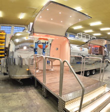 · Sonderbau-Chassis, zul. GG 3,5 to gewerbetauglich im Tauchbad verzinkt ALKO Fahrwerk, 6 x 10" Räder, Chromfelgen · Individualgrundriss nach Kundenwunsch · Schiebefenster für den Winterbetrieb · HACCP-gerecht, hoher Hygienestandard · Edelstahlausbau ohne Holzkern · Alu-Wabenplatte als Grundboden · 1 x Ausgabeklappe 250 cm breit · 2 x Bühnenklappen 200 cm breit · Eingangstür versetzt und mit Bullauge · 2 Podesttreppen verbunden 2 Bühnen-Podeste zum Gastraum mit Edelstahl Handläufen mit Vinylan-Boden · Power 400 V / 2 x 32 A CEE · Hochglanz polierte Außenhülle · LED / RGB Stripe im Innenraum, am Unterboden sowie in den Bühnentreppen · 2 beleuchtete Dachaufbaugestelle mit Werbetafeln und zur Aufnahme von Monitoren · 2 Eventzelte an den Bühnenklappen aus transparenter Plane gefertigt.